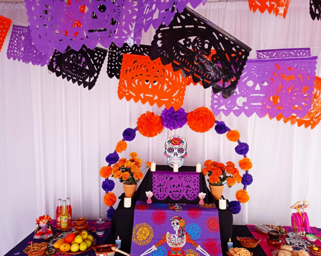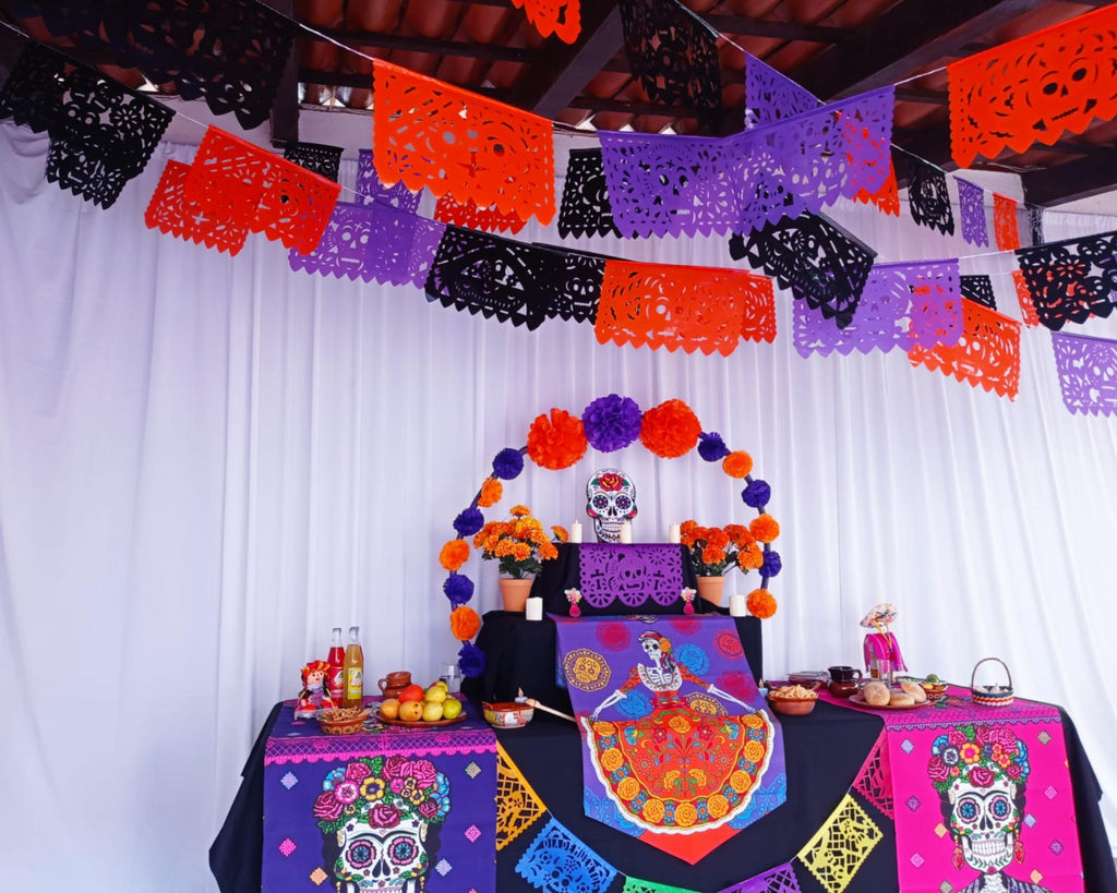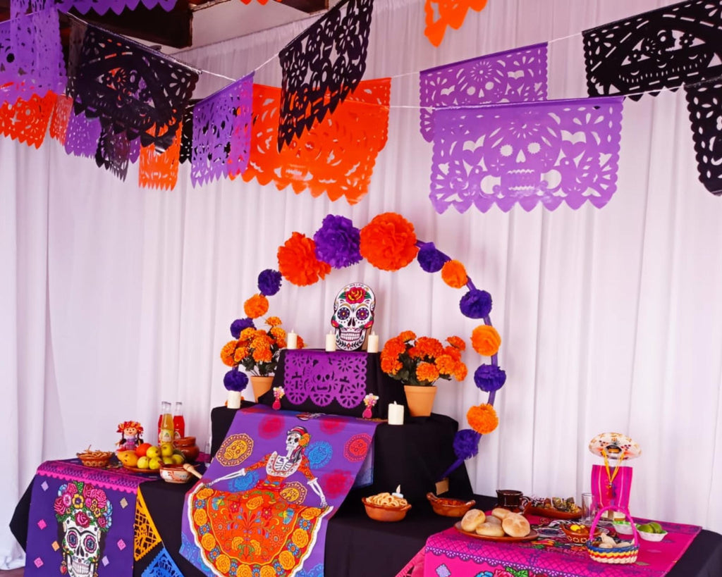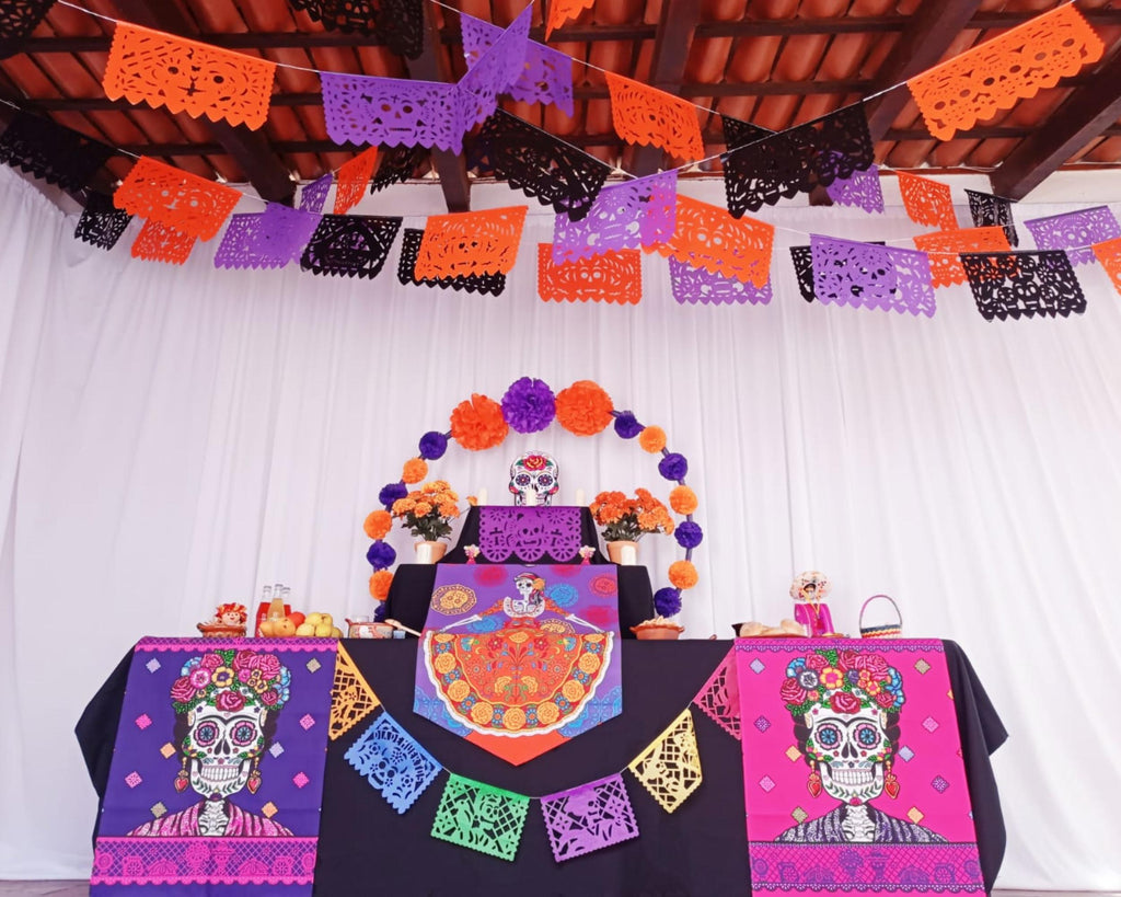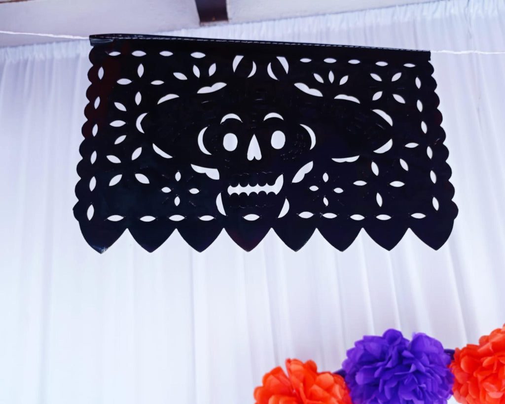 The bright, colorful Mexican garlands feature traditional Day of the Dead.