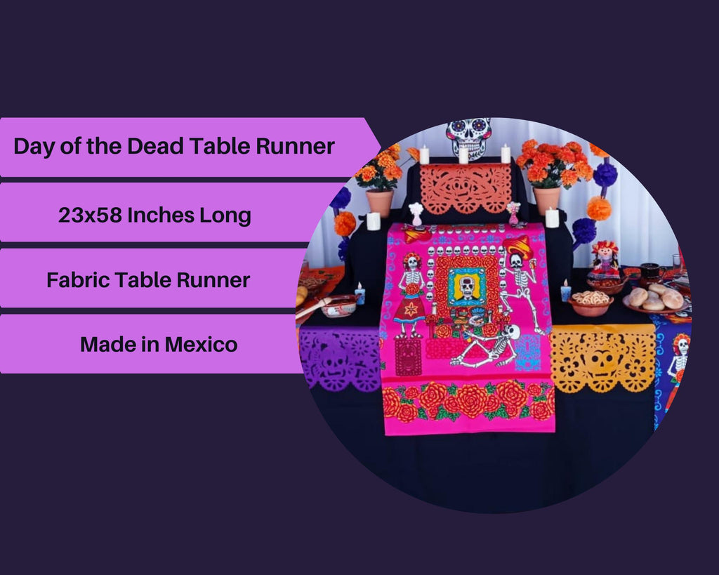 Celebrate Day of the Dead with this festive Mexican table runner! Featuring a traditional Mexican ofrenda setting and other traditional Mexican designs, this pink Mexican table runner will be a hit at your next fiesta. Use it for Dia de los Muertos, Cinco de Mayo, weddings, and any other fiesta you have coming up!