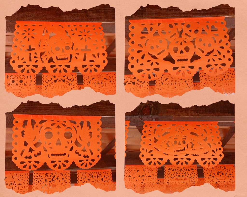 Spanish: 5 tiras de papel picado  y con formas de craneos para ofrendas del dia de muertos y excelentes decoraciones mexicanas para fiestas en interiores y exteriores. Faciles de manejar y con colores llamativos para todo tipo de eventos.