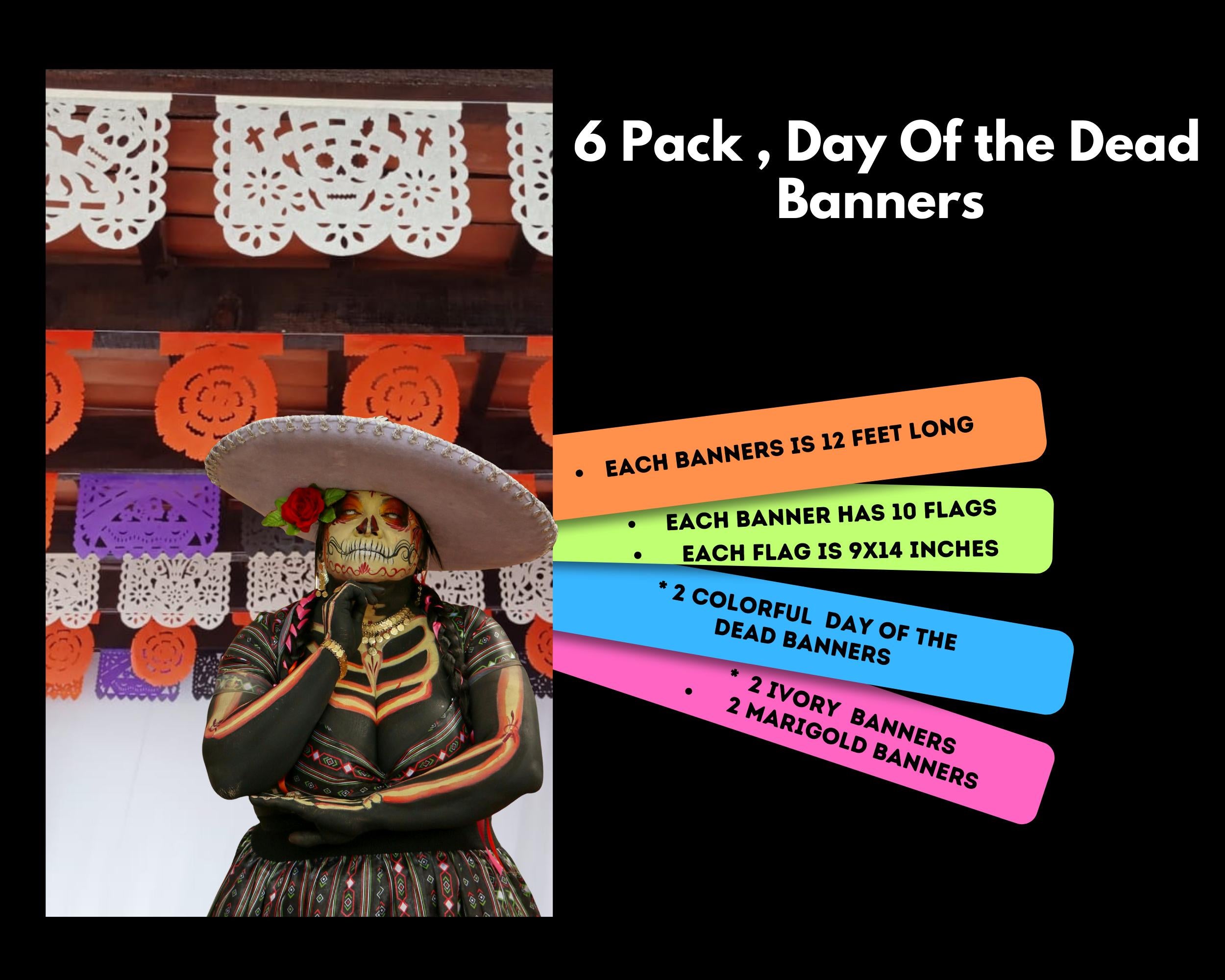 Each banner measures 12ft long, so you will receive a total of 72 feet to banners to docorate with. Made from tissue paper.